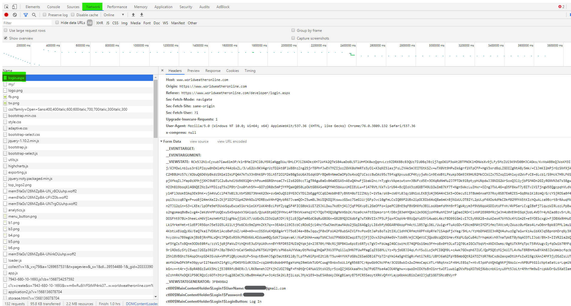 Для авторизации на сайте нам необходимо в запросе отправить пользовательские данные на сайт. Помимо логина и пароля, мы должны отправить сайту ключи, которые содержатся в заголовках пакета. Чтобы узнать эти ключи нужно выйти из нашей учётной записи, перейти на страницу входа, затем открыть в браузере Developer tools (F12), перейти на вкладку Network и снова авторизоваться. После того как страница загрузится в Developer tools во вкладке Network пролистайте вверх и найдите строчку login.aspx.