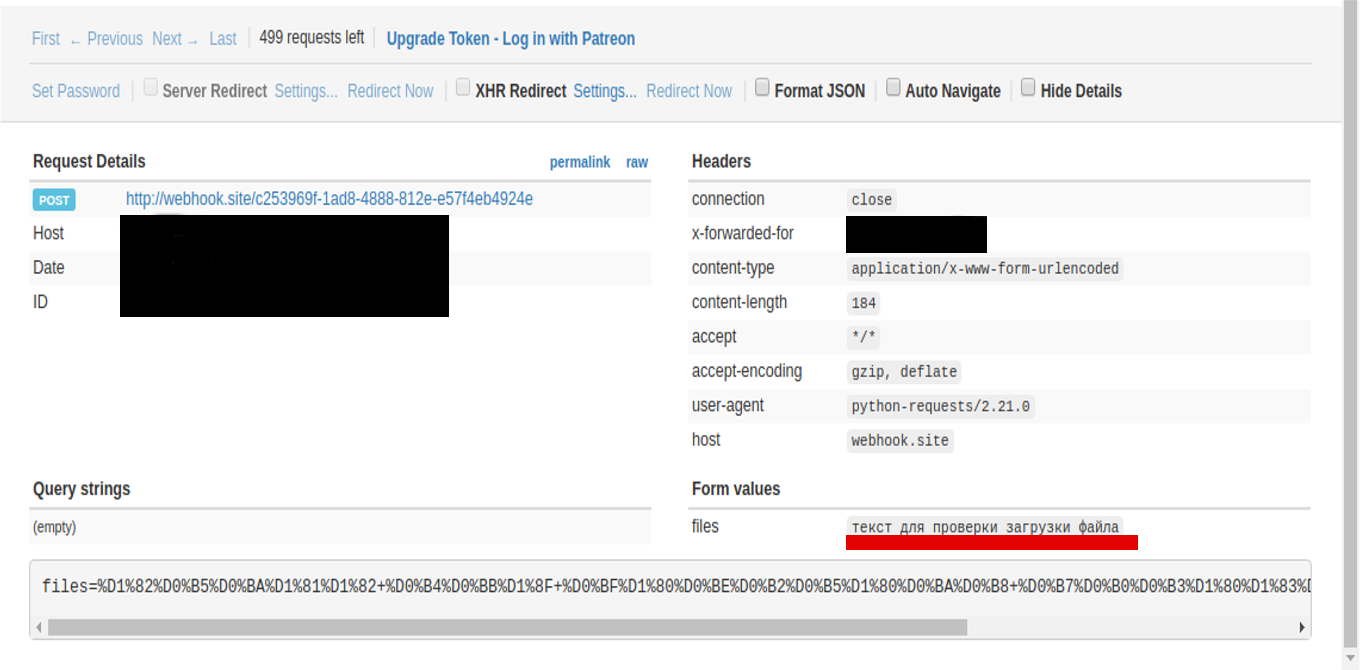 После выполнения скрипта в терминале мы увидим уже знакомый нам объект класса Response и статус код - 200. Это означает, что запрос выполнился. Вернемся снова на сайт Webhook.site, выберем в правой колонке наш запрос и сможем посмотреть содержание выполненного запроса: